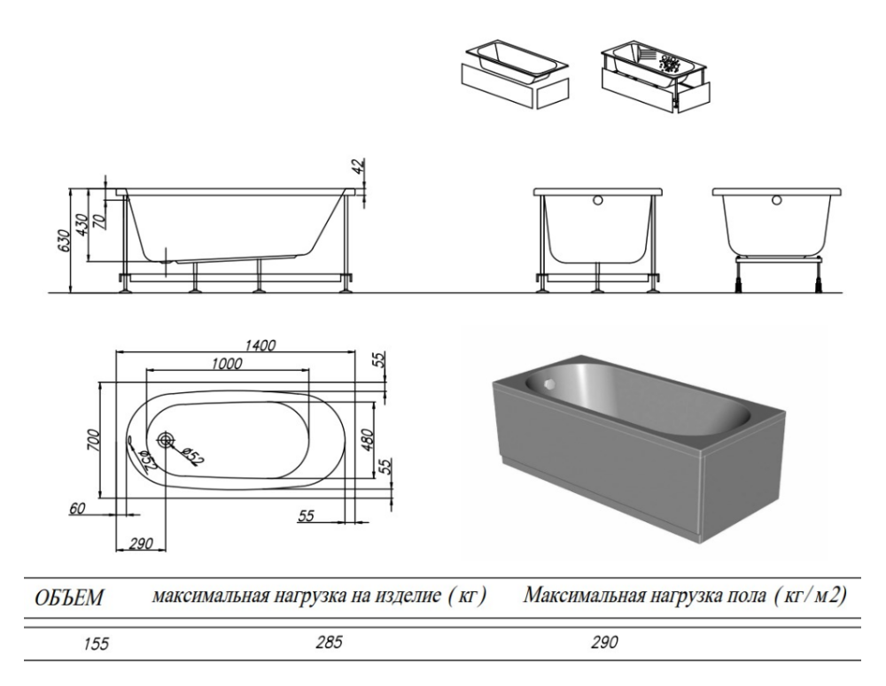 Ванна представлена в 6 востребованных размерах.
