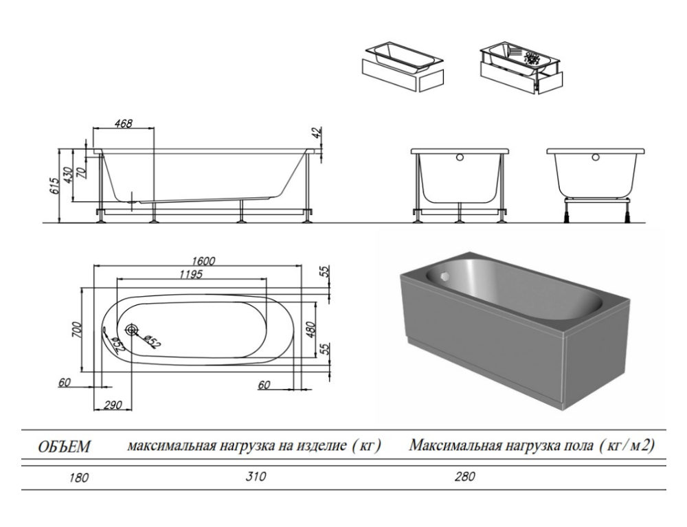 Ванна представлена в 6 востребованных размерах.