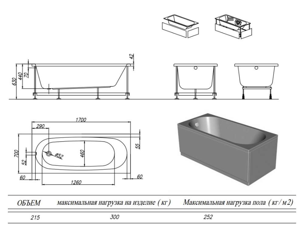 Ванна представлена в 6 востребованных размерах.